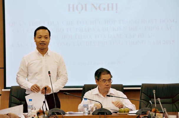Ngày 15/5, Bộ Tư pháp đã tổ chức Hội nghị quán triệt Quy chế tổ chức họp trong hoạt động của cơ quan Bộ Tư pháp và dự kiến điều phối các hội nghị, hội thảo, tọa đàm, tập huấn, các chuyến công tác địa phương trong năm 2015. Tham dự Hội nghị có đại diện Văn phòng Chính phủ, Vụ Cải cách hành chính - Bộ Nội vụ, đại diện Lãnh đạo các đơn vị thuộc Bộ. Thứ trưởng Đinh Trung Tụng đã chủ trì Hội nghị.
